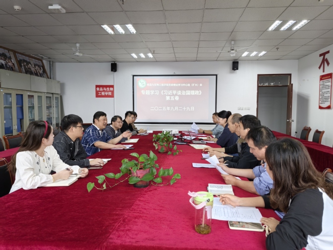 9月29日,食品与生物工程学院党委理论学习中心组召开专题学习(扩大)会,专题学习《习近平谈治国理政》第五卷第十专题《全面推进美丽中国建设》。院党委书记王永斌主持会议,党委理论学习中心组成员、科级干部和党支部书记参加会议。