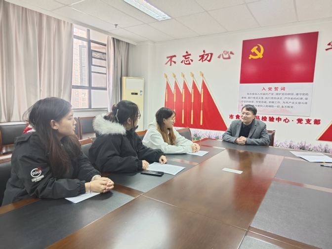 2025年11月14日上午,食品与生物工程学院副院长马龙、毕业班辅导员徐庆一行赴蚌埠市产品质量监督检验研究院及蚌埠市食品药品检验中心开展实地走访,与在该单位实习的毕业班学生深入座谈,全面了解学生实习情况,强化安全教育管理。