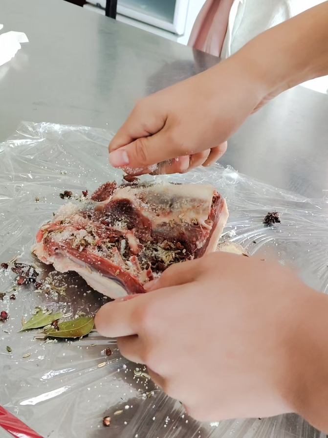 实操环节中,同学们分组协作,全身心投入到风鹅制作的匠心过程中。他们依照指导,仔细剔除光鹅身上残留的绒毛,反复冲洗后浸泡沥干,随后在胸脯、腿内侧精准划口,为风鹅后续入味做好准备。在香料盐炒制时,同学们以小火慢炒粗盐与香辛料,并不停翻动,直至盐粒微微泛黄、香气四溢。晾凉后,再加入生姜、葱段与高度白酒,感受料香与盐香的完美融合。到了腌制环节,大家将调配好的香料盐均匀涂抹在鹅身内外,尤其对刀口处进行重点按摩,随后将鹅肉层层码放入腌制盆中,认真复刻传统工艺的每一处细节,在动手操作中体会传统手作的严谨与乐趣。